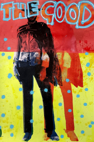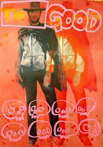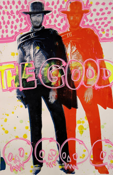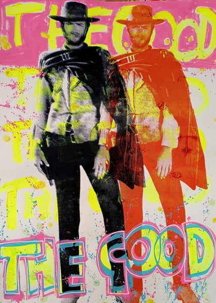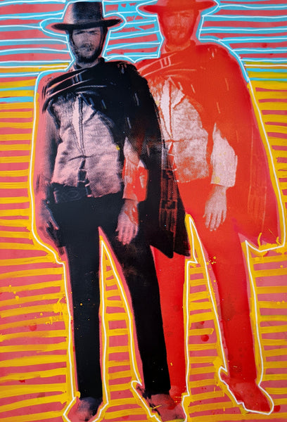 In these prints, I’m remixing that legendary image of Eastwood into something new and vibrant. The Print With No Name series is all about that mix of old-school cinema iconography and modern pop art. Each print is a hand-finished piece of art, with layers of colour and detail that make it one of a kind.